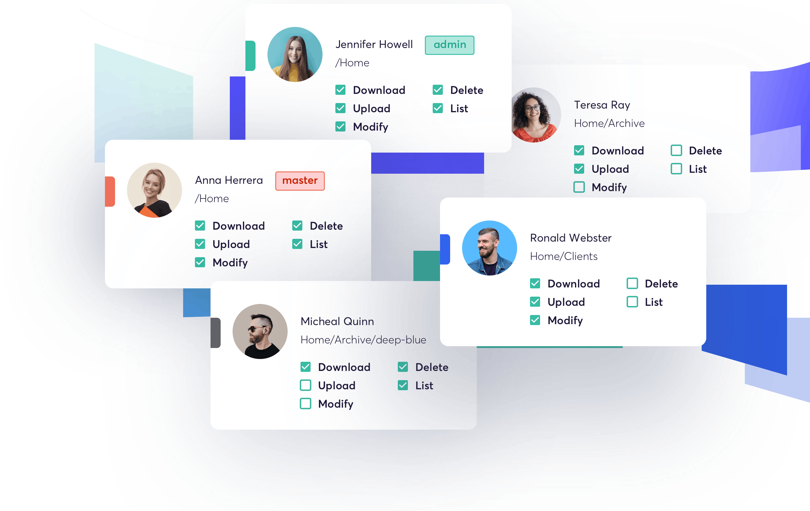 User access can be restricted to allow any combination of sharing, sending, uploading, downloading, deleting, modifying files/folders, and more. Learn more about permissions management.